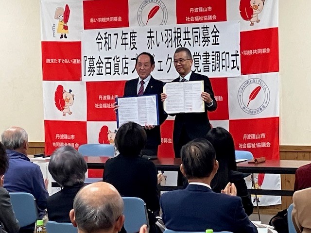2025年12月25日に丹波篠山市社会福祉協議会さまとの「赤い羽根募金」の覚書調印式に参加しました。2026年1月からの3月末まで、体験工房でのジャムづくり体験参加費とアンテナショップでのジャム類の販売額の1%を社協さまに寄付し、地域福祉に役立てていただきます。2026年4月からはこの取り組みを継続し、年間を通じて息の長い支援を継続していく予定です。